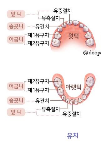- 유견치 : 생후 16개월~22개월 (상악유견치 - 하악유견치)